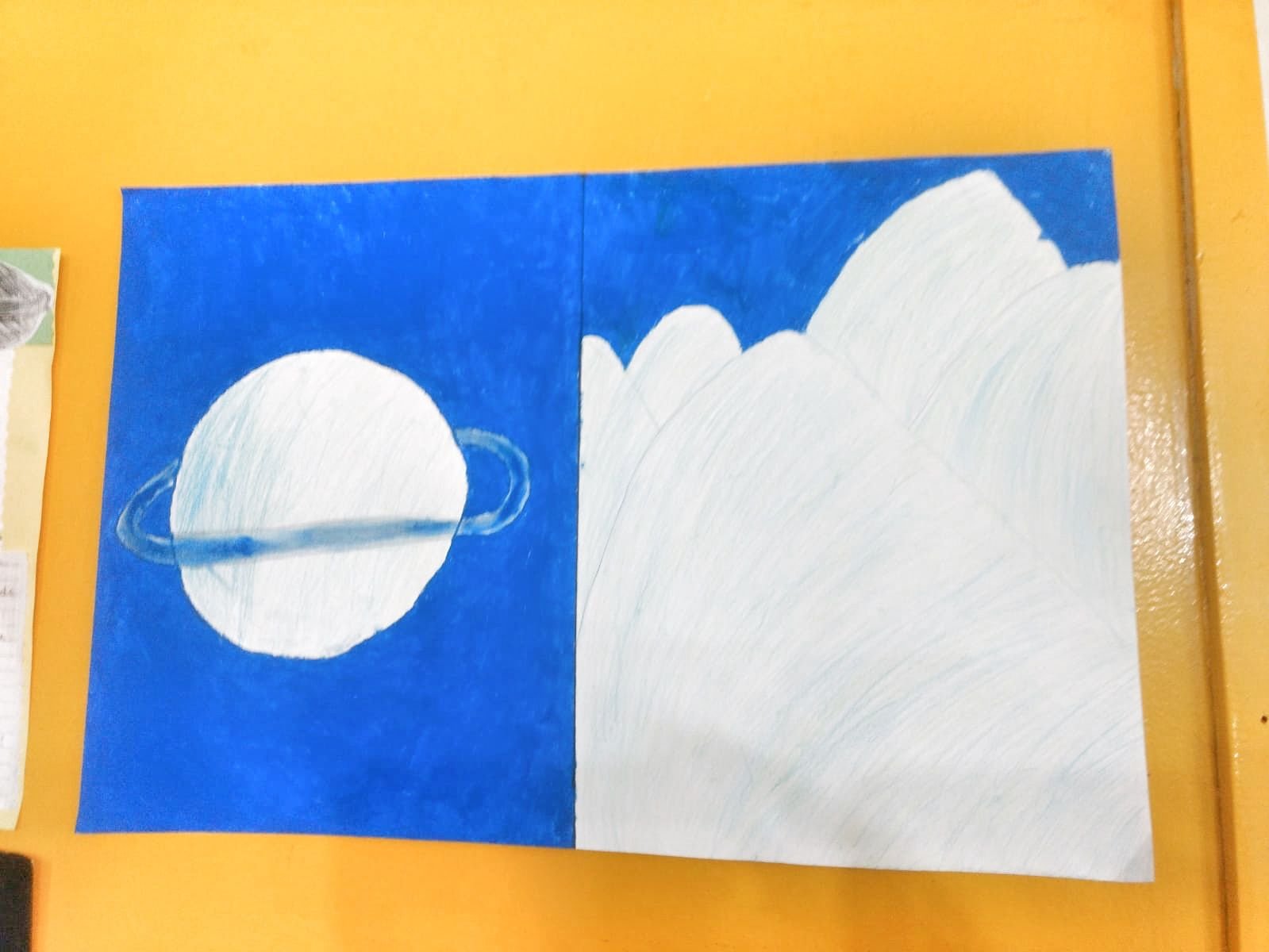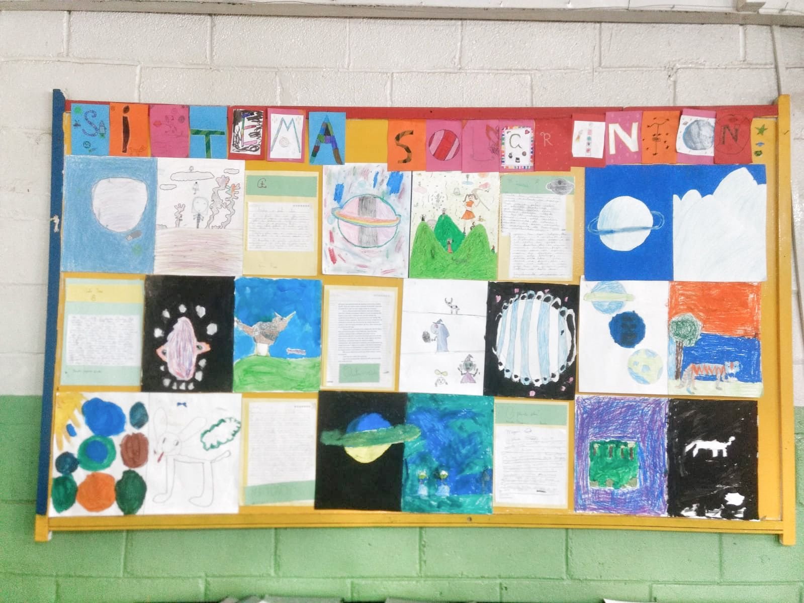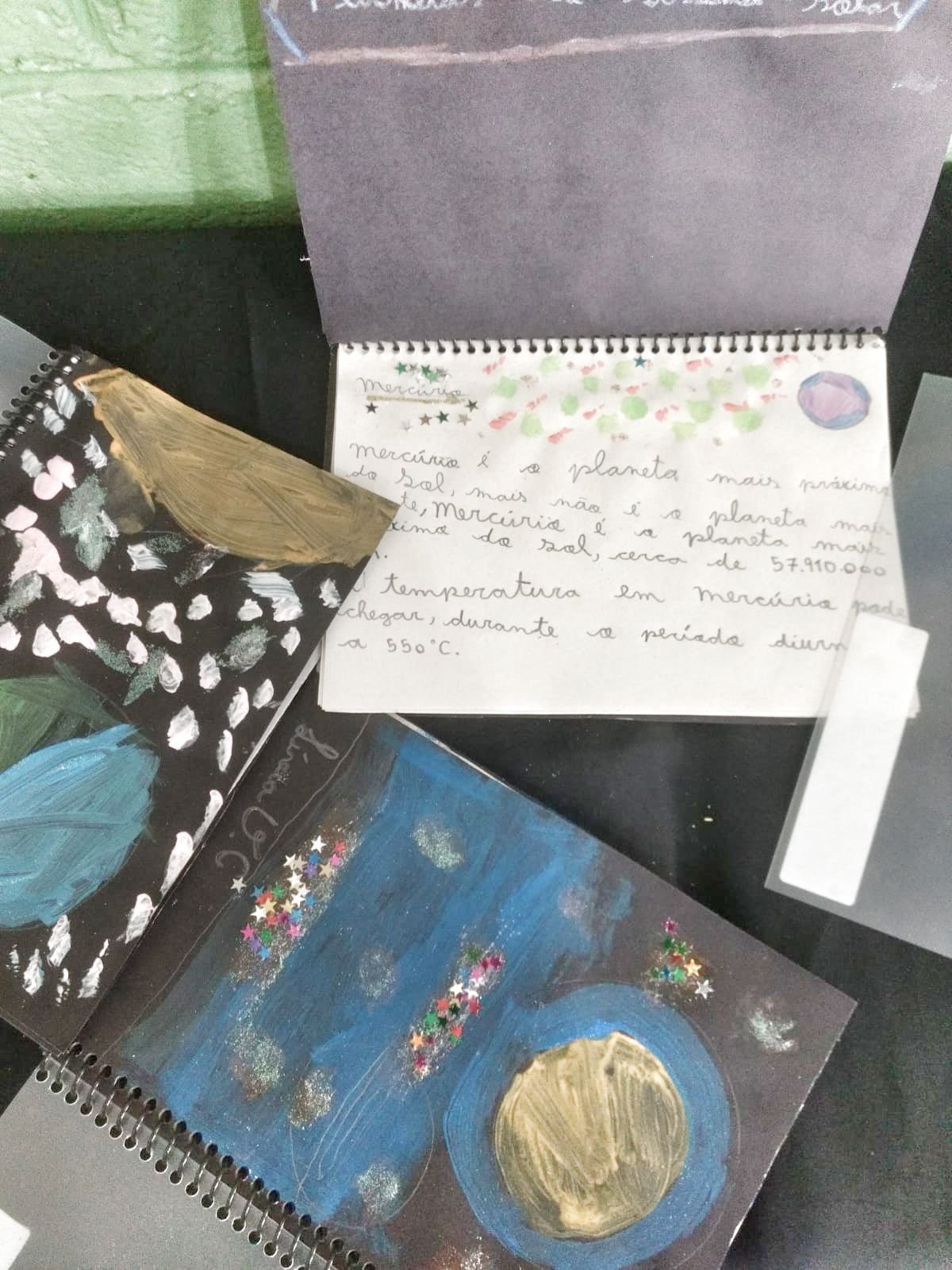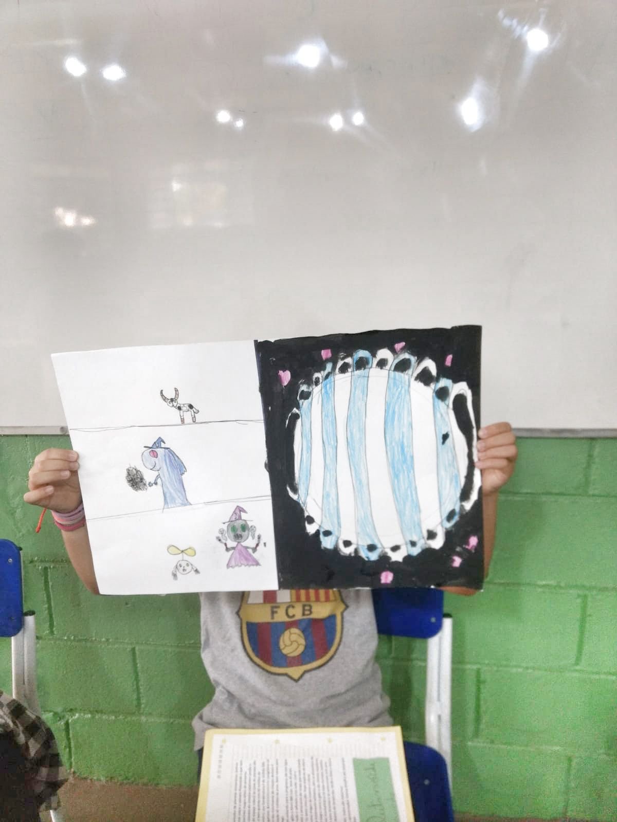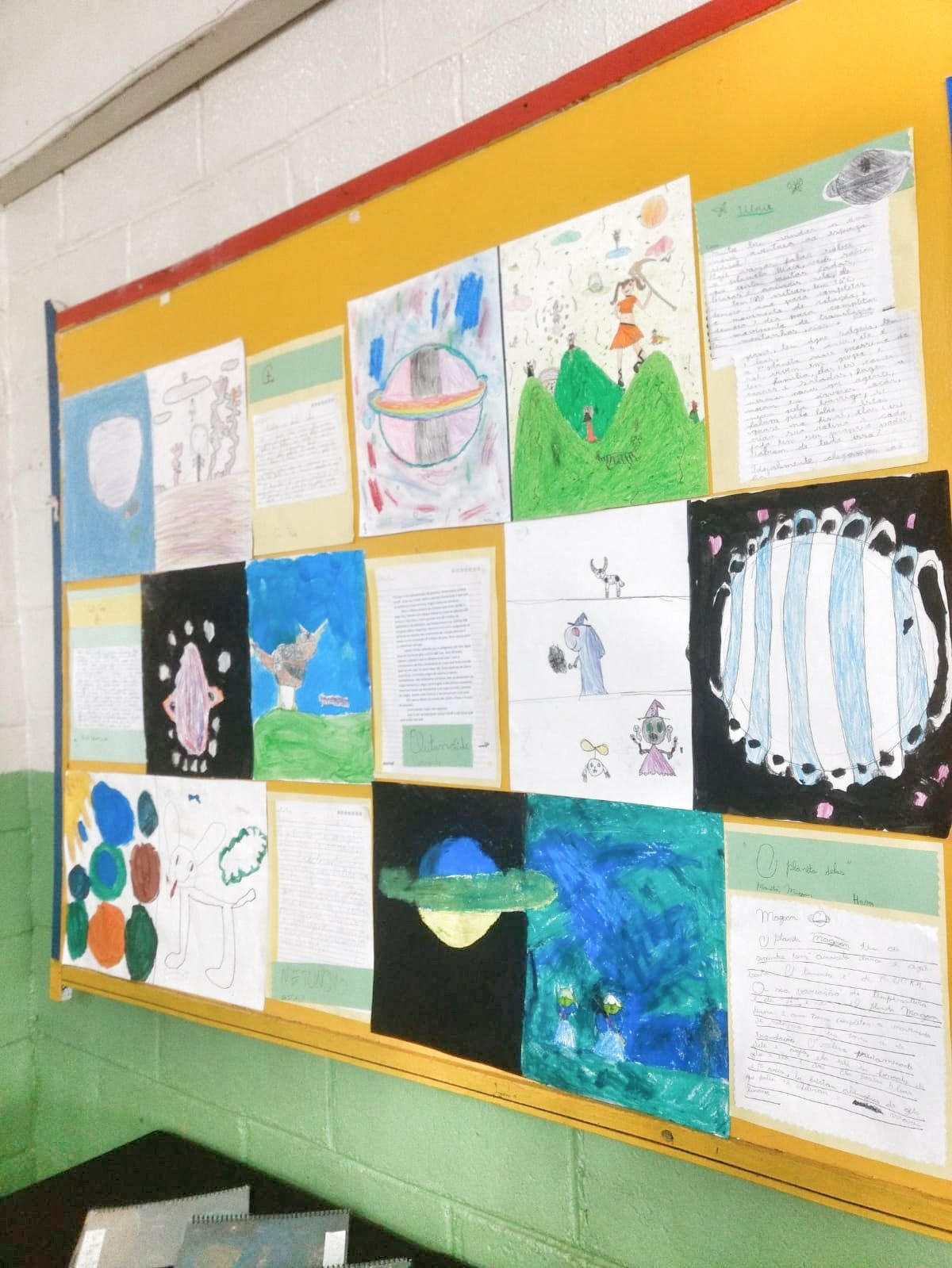 Nós, turma do 4º ano, iniciamos o semestre letivo com a leitura coletiva do livro “Ei, tem alguém aí?” de Jostein Gaarder. Através de um olhar sensível, o autor compartilha com o leitor o encontro de um menino e um garotinho que parece vir de outro planeta. Os dois trocam experiências e ideias sobre a origem da vida, fazendo nascer uma amizade pura e inusitada. A partir das questões disparadas pela história, fomos instigados a pensar sobre a vida na Terra, ampliando os olhares para além de nosso planeta. Juntos, viajamos pelo espaço Sideral, visitando os 8 planetas do Sistema Solar e realizando descobertas sobre o Sol, a Lua e as constelações. Entendemos o porquê do dia e da noite e das quatro estações do ano. Ao mesmo tempo em que respostas eram encontradas, mais perguntas surgiam, fazendo com que nosso projeto tomasse novos rumos. Quando nos demos conta, já havíamos dado vida ao Sistema Solarinton. Cada criança inventou seu próprio planeta, atribuindo um nome a ele, pensando em suas características geofísicas e nas espécies que lá habitam. Através de uma composição artística, criamos um mural em nossa sala com as pinturas de nossos planetas imaginários e seus habitantes, acompanhados de textos explicativos e descritivos. O resultado? Um planeta mais criativo e divertido do que o outro!