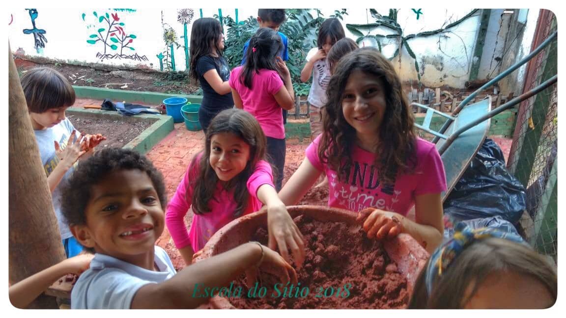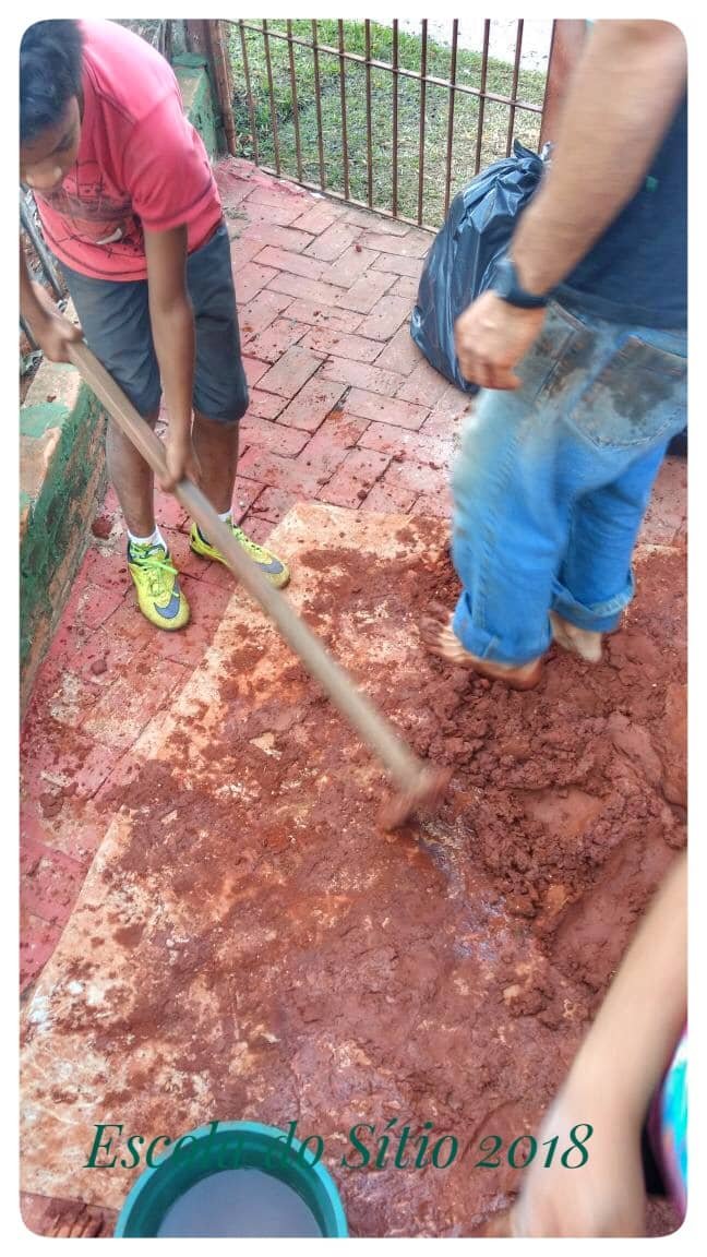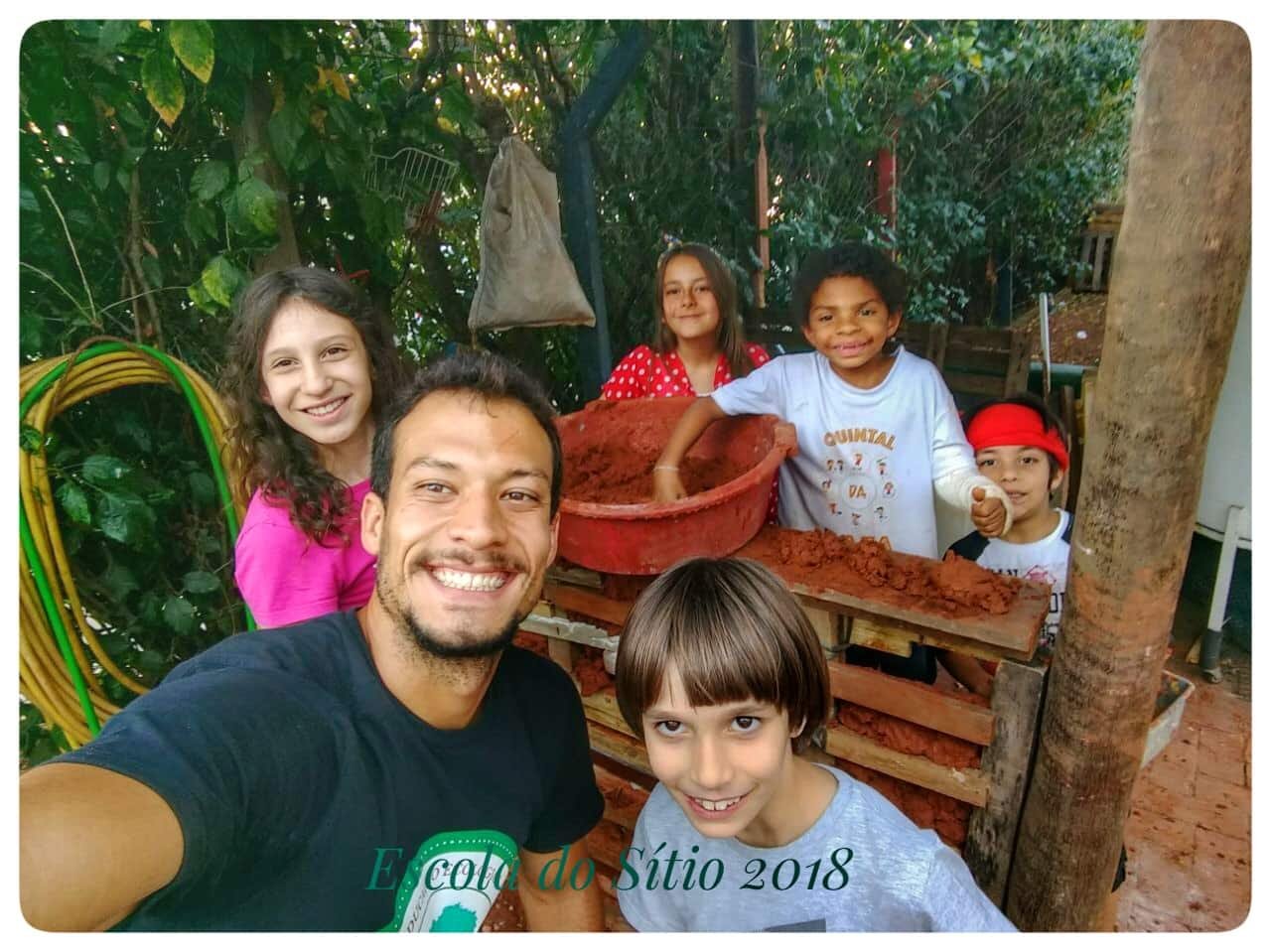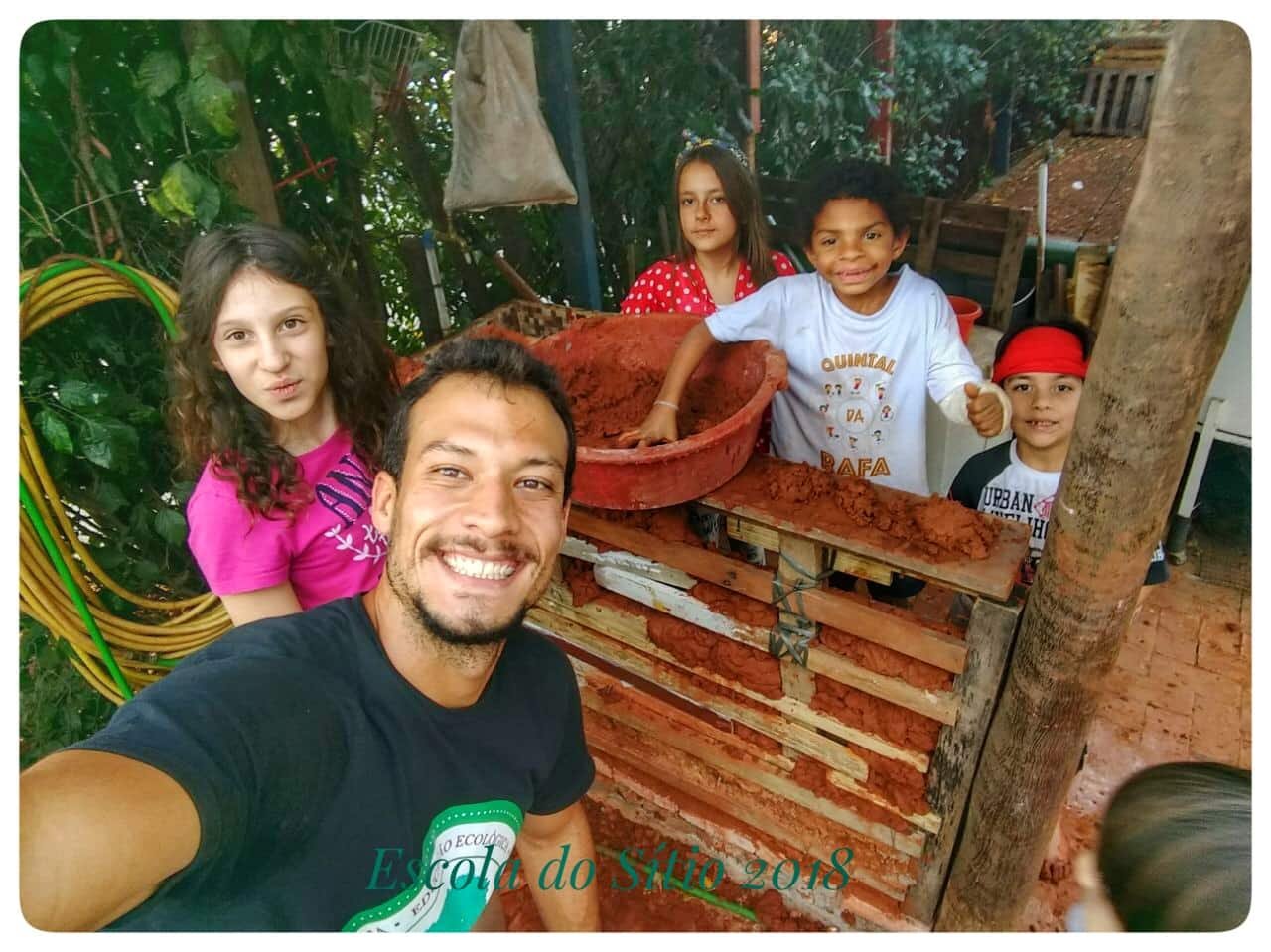 Na aula de Sustentabilidade os professores Rafael e Rodrigo estão trabalhando a bioconstrução com os nossos alunos. Utilizando os recursos disponíveis passaram a construir as paredes da casinha da horta com terra e areia da escola e reutilizando madeira de descarte!! A obra está avançando… 😛