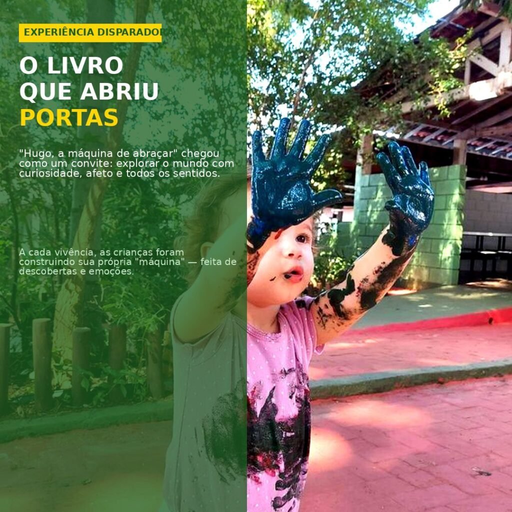 O livro “Hugo, a máquina de abraçar” chegou à nossa turma do Maternal 1 como uma Experiência Disparadora — aquele convite especial que abre portas, desperta a curiosidade e coloca a criança em relação direta com o mundo. Nesta semana, esse convite ganhou forma, cor e muita textura em nossa escola.