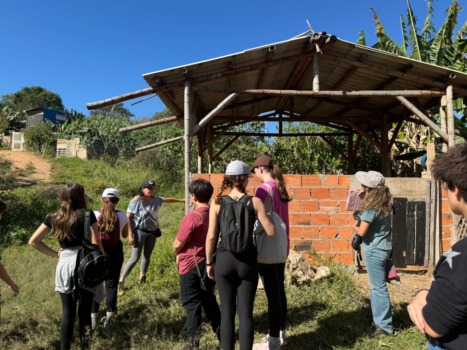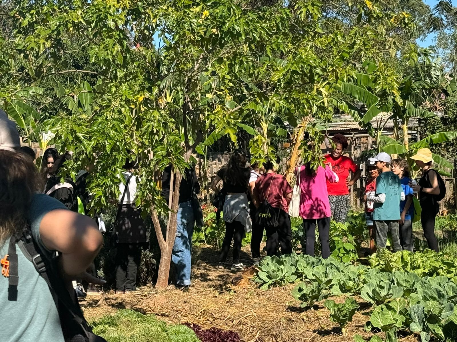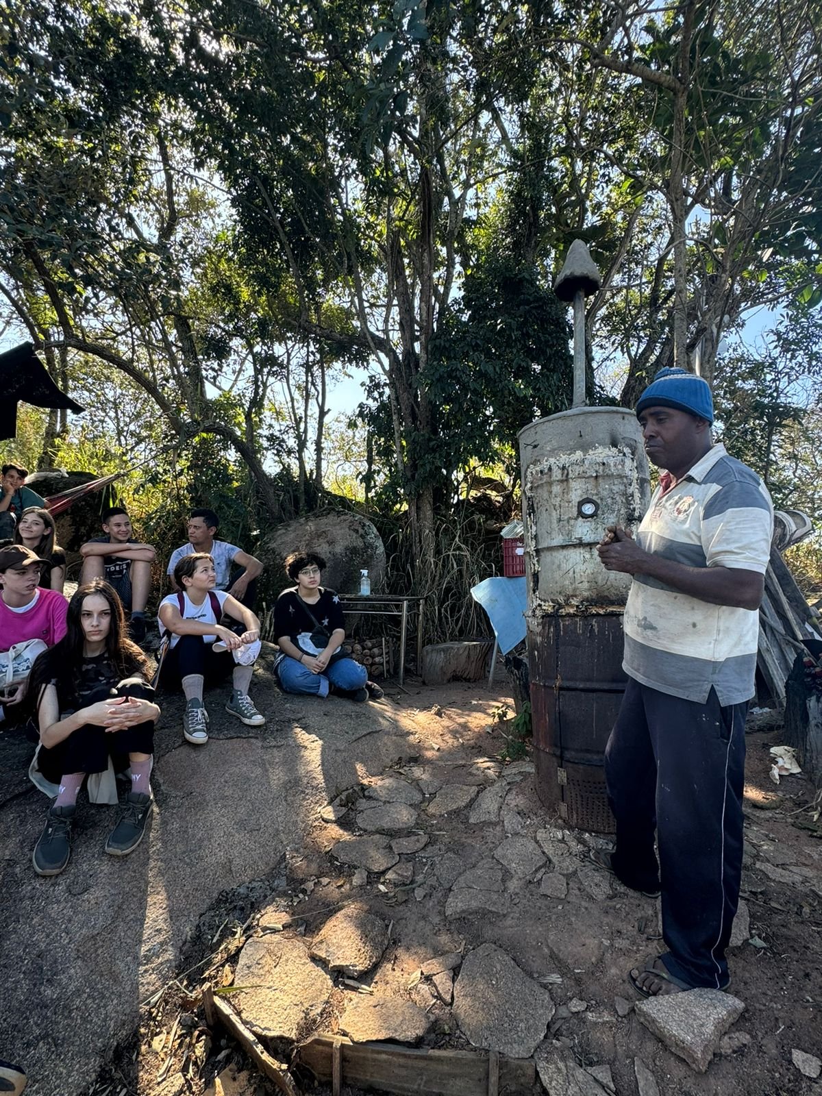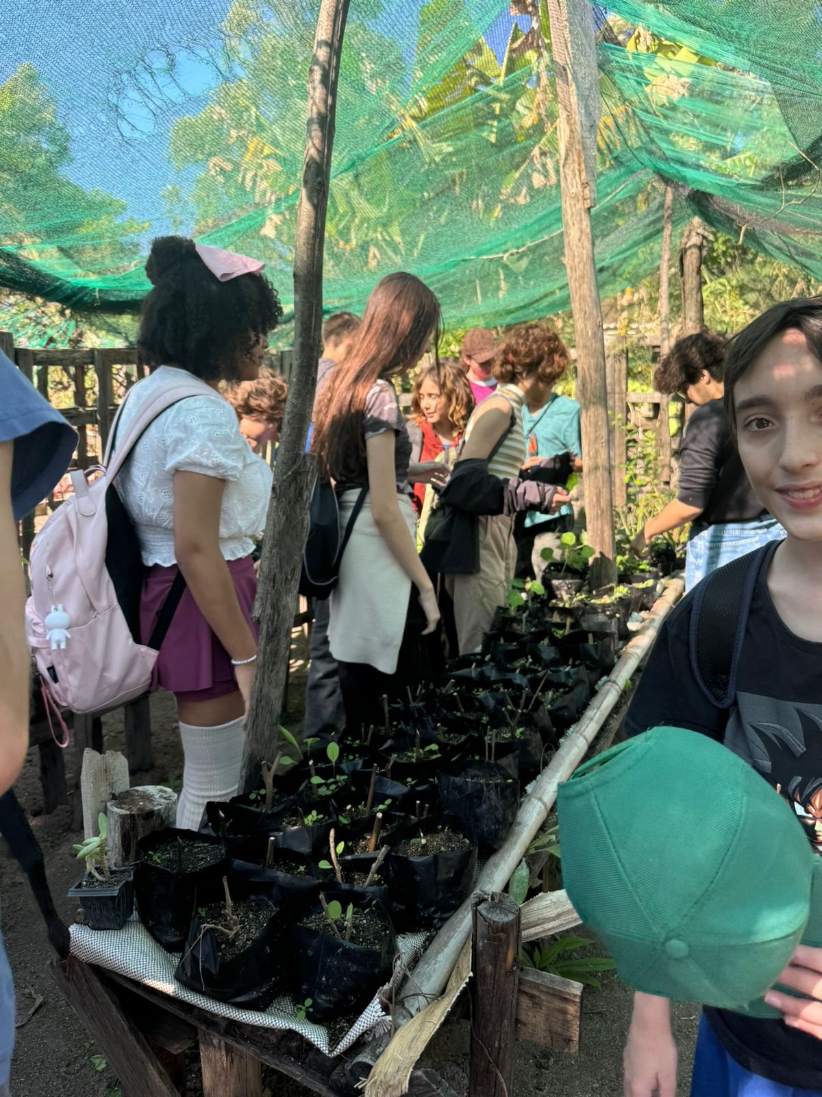 “Era o que eu queria, era o que eu sonhava” – foi dessa forma que Gil, morador do Acampamento Marielle Vive, orgulhoso da horta de plantas medicinais de que cuida e do defumador de carnes que criou, definiu o que o acampamento significou na vida dele. A visita da turma do 8º ano ao Acampamento foi pensada dentro dos conteúdos da disciplina de Geografia e do tema disparador da turma – “Antes de… tudo tem um ponto de partida”. Assim, a pergunta que nos colocamos foi: como era o cultivo de alimentos antes da produção em massa voltada para a exportação? É possível, hoje, um modelo diferente desse? A ideia era conhecer um espaço que pressupõe o uso social da terra, colocando em prática na “horta mandala” conhecimentos ancestrais e técnicas atuais, com o intuito de manter uma produção sustentável e orgânica. A visita extrapolou em muito a intenção inicial. Junto das práticas produtivas, conhecemos a história do Acampamento e sua organização detalhada, com os nove setores, compostos por núcleos familiares, cada um com funções e tarefas bem estabelecidas, para compor as demandas coletivas. Vimos como as assembleias, tema tão trabalhado na escola, acontecem no “mundo real” e podem pautar decisões de uma comunidade de centenas de pessoas. Ouvimos histórias, muitas histórias, e fomos convidados a olhar para o elemento humano que sustenta o que usualmente se noticia por uma sigla – MST. E, assim, conhecemos Ezequiel, recém formado técnico em agroecologia e agrofloresta, que passa boa parte dos dias em reuniões e decisões e se refugia na natureza quando precisa de silêncio. Soubemos que Cintia, do núcleo de comunicação, foi ex-aluna da Escola do Sítio e hoje vive no Acampamento, compartilhando seus conhecimentos em arquitetura. Fomos recebidos por Luciana, que vive no Marielle desde que a filha tinha 2 anos, quando a distribuição de água lá era uma questão ainda mais desafiadora do hoje (em que um caminhão pipa abastece diariamente a comunidade, concedendo restritos 100 litros diários de água por família, que carrega esse bem essencial em tonéis até cada habitação). Fomos acolhidos por Lia, que abriu sua casa para nos emprestar o banheiro, e contou como o Coletivo Marielles, que fomenta a independência das mulheres, a tornou consciente das opressões de gênero da nossa sociedade e abriu a ela novas possibilidades. E terminamos nossa visita com um almoço preparado pelas pessoas responsáveis pelo setor da cozinha, que serve de 80 a 100 refeições por dia, aos moradores que precisam. Saímos de lá com um grupo de adolescentes falantes, risonhos, tomados por vida. Que tiveram contato com uma realidade muito distinta da que conhecem em suas rotinas, mas que também puderam perceber a sabedoria existente no que parece simples ou a força vinda dos desafios partilhados em comunidade. Adolescentes que, talvez, tenham saído inspirados a buscar construir em suas próprias trajetórias a fala de Gil – “era o que eu queria, era o que eu sonhava”. Professoras: Ludmila (Geografia) e Silvia (História) Coordenadora pedagógica: Daniele Megid