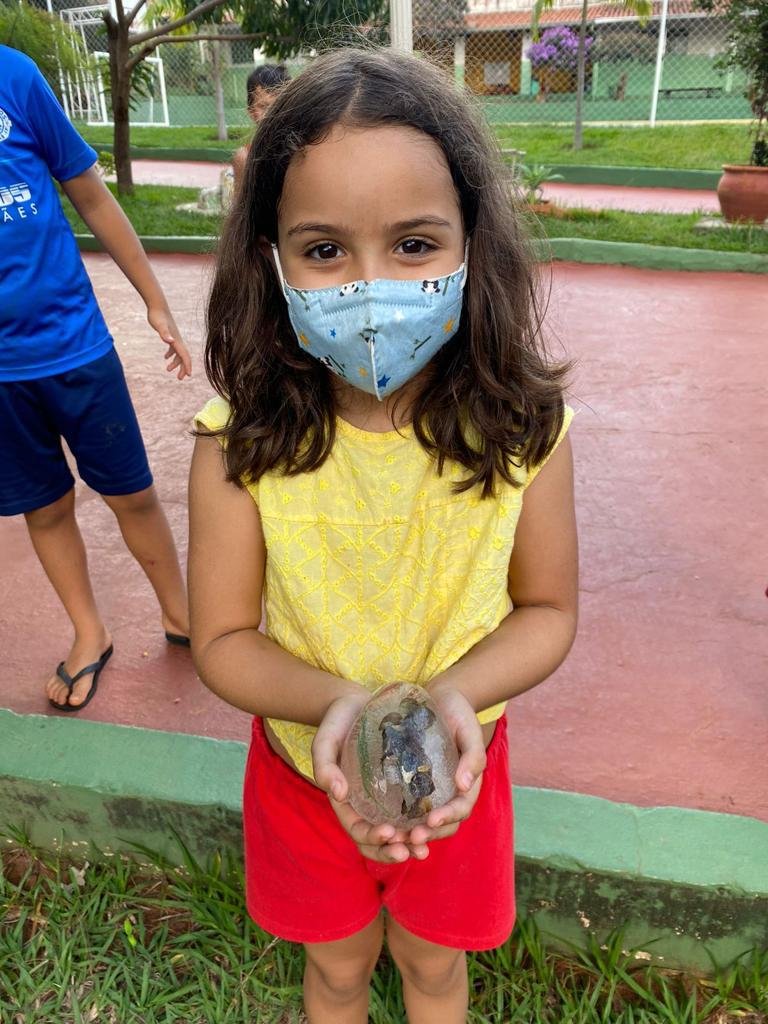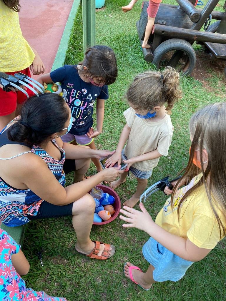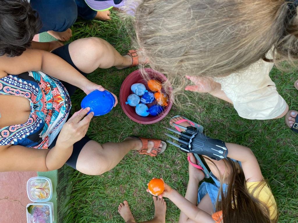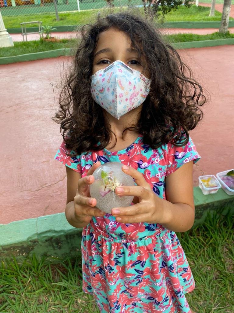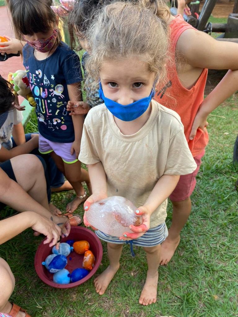 As crianças transitaram pela escola em busca de coletar elementos da natureza para compor a atividade. Após a coleta, os elementos foram congelados com água dentro das bexigas.