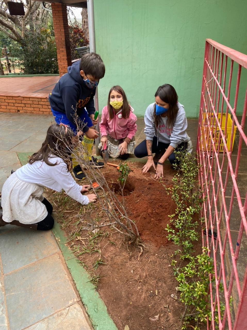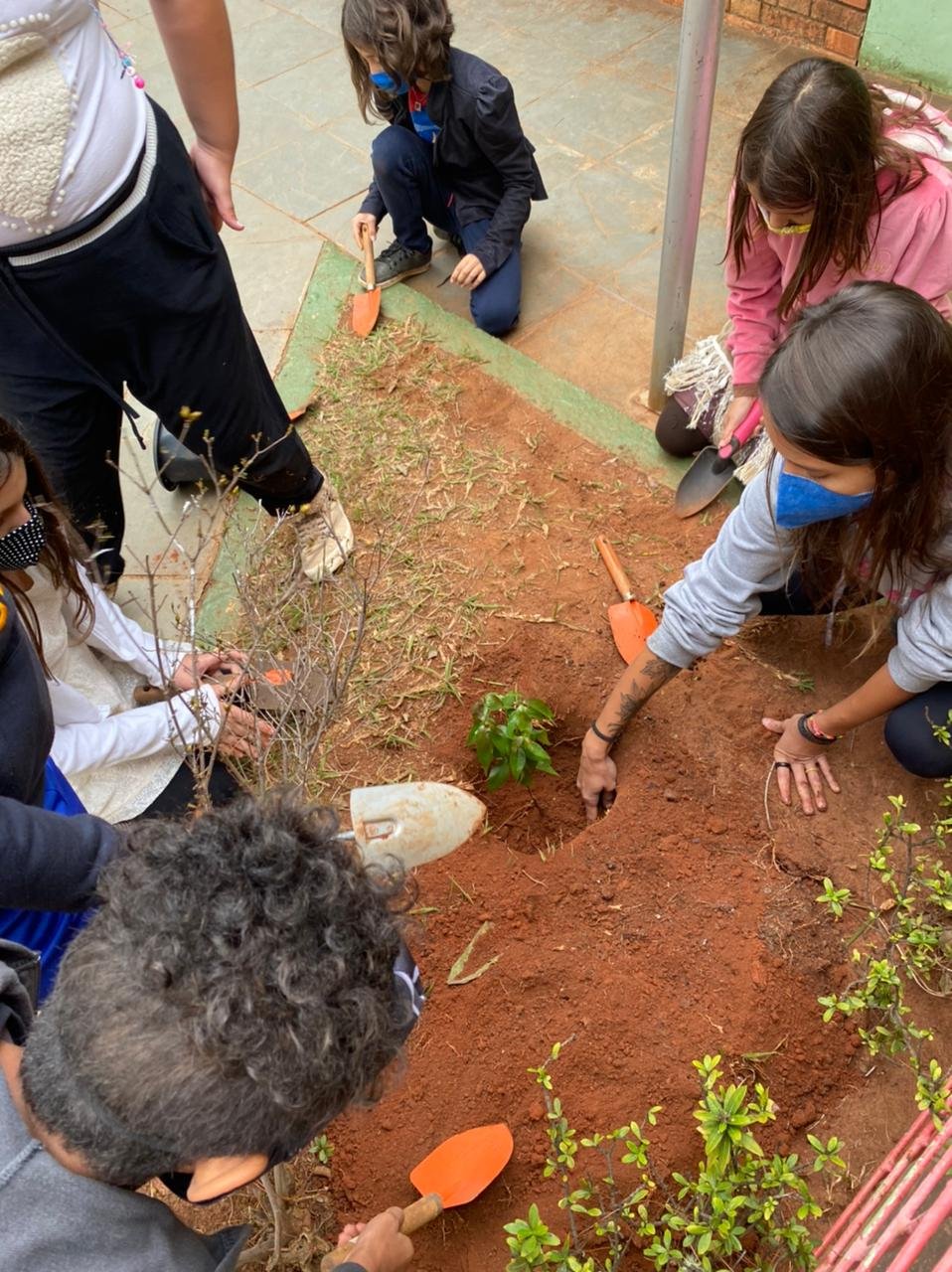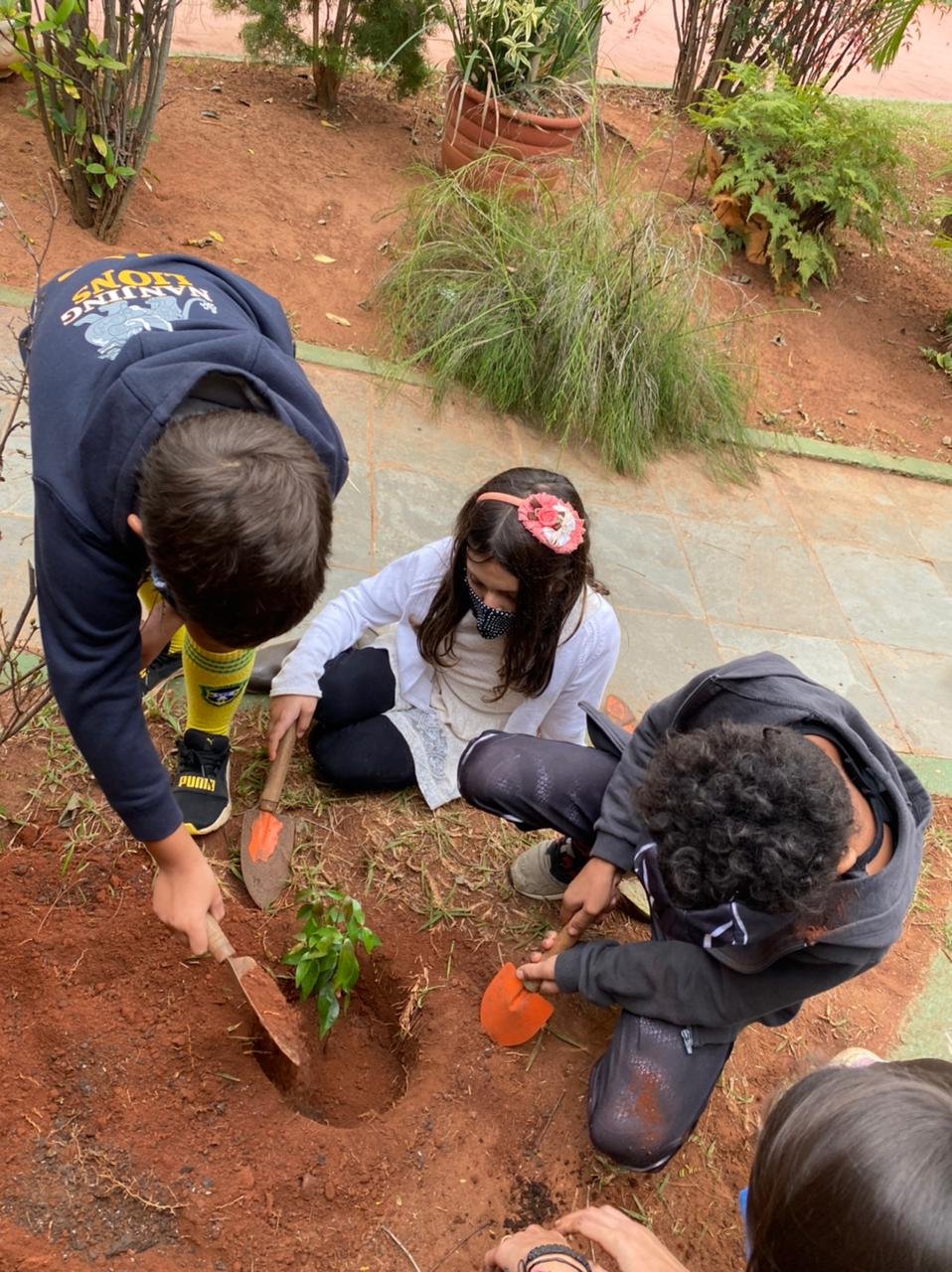 Além de pesquisadores, a turma também colocou a mão na massa – ou melhor, na terra! Pensando nas questões relacionadas às práticas de reflorestamento, as crianças sugeriram que fosse plantada uma árvore em nossa escola e, com a ajuda de várias mãozinhas, Eugenia – a Pitangueira, firmou suas raízes em solo da Escola do Sítio. A ação abriu portas para novas descobertas referentes aos cuidados que devemos ter para que Eugenia cresça forte e possa compartilhar conosco sua sombra e seus deliciosos frutos. É importante lembrar que a turma que está em casa, acompanhando as aulas online, não ficou de fora dessa experiência. Cada aluno foi presenteado por uma muda de pitanga, vinda diretamente do quintal da professora, para que seja plantada e cuidada em casa, permeada pelo carinho da família. E que venham muitas pitangueiras por aqui!